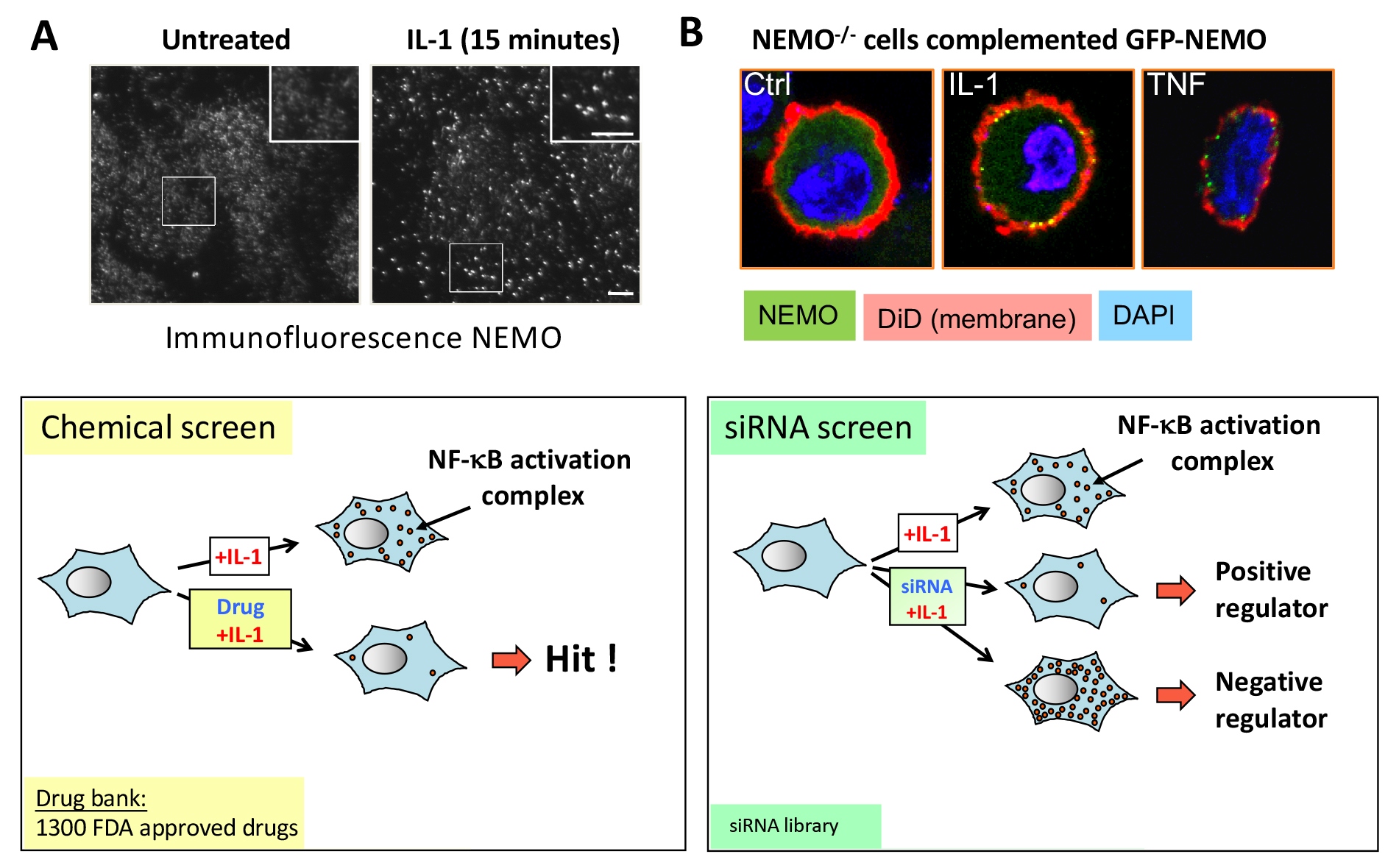 Nous avons montré que l’IL-1 induit le recrutement rapide et transitoire du complexe NEMO/IKK dans des structures supramoléculaires juxta-membranaires nécessaires à l’activation de NF-kappaB. Nous avons utilisé cette découverte pour réaliser des criblages pharmacologiques (médicaments approuvés par la FDA) et génétiques (siARNs). Ces approches ont permis d’identifier de nouveaux régulateurs et inhibiteurs de ces complexes d’activation de NF-kappaB. Ainsi nous avons montré que l’Auranofine, inhibe NF-kappaB et bloque l’entrée du virus SARS-CoV-2 dans les cellules faisant de cette molécule un traitement potentiel de la COVID-19.